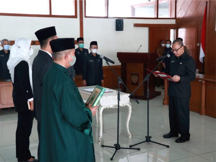 INDRAMAYU, indramayunews.id – Sekretaris Daerah (Sekda) Kabupaten Indramayu Rinto Waluyo melantik dan mengambil sumpah 59 penyetaraan Jabatan Administrasi ke dalam Jabatan Fungsional di lingkungan Pemerintah Kabupaten Indramayu. Proses pelantikan ini dilakukan di Ruang Ki Tinggil Indramayu, Senin (30/5).