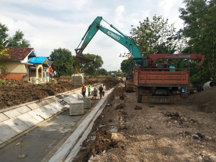 Pengerjaan Saluran Pasirangin di Cikedung Kidul dan Desa Cikedung Lor Kecamatan Cikedung. Pekeja sedang pasang balok bawah, pasang cor balok atas serta perapihan tanggul.