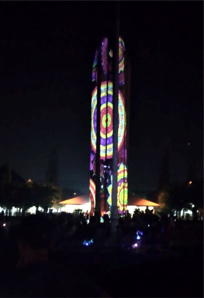 Berlatar Tugu Bambu Runcing yang dijadikan sebagai background, tayangan video mapping ini berhasil memukau penonton. Ditambah dengan tata suara yang membuat suasana alun-alun menjadi semakin meriah, penonton yang datang menjadi semakin terhibur.