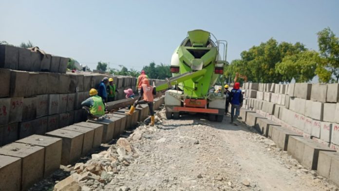 INDRAMAYU, indramayunews.id – Perkembangan proyek Breakwater (Pemecah gelombang) yang berlokasi di Pantai Glayem Desa/Kecamatan Juntinyuat Kabupaten Indramayu, oleh Balai Besar Wilayah Sungai (BBWS) Cimanuk Cisanggarung (Cimancis) saat ini sudah masuk tahapan pembangunan Groin dan penyususnan beton kubus serta pencetakan material kubus, Kamis (21/7).
