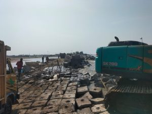 Saat ini sejumlah pekerja masih terus melakukan pelangsiran kubus beton, untuk dipasang di sepanjang lepas pantai melalui tongkang.