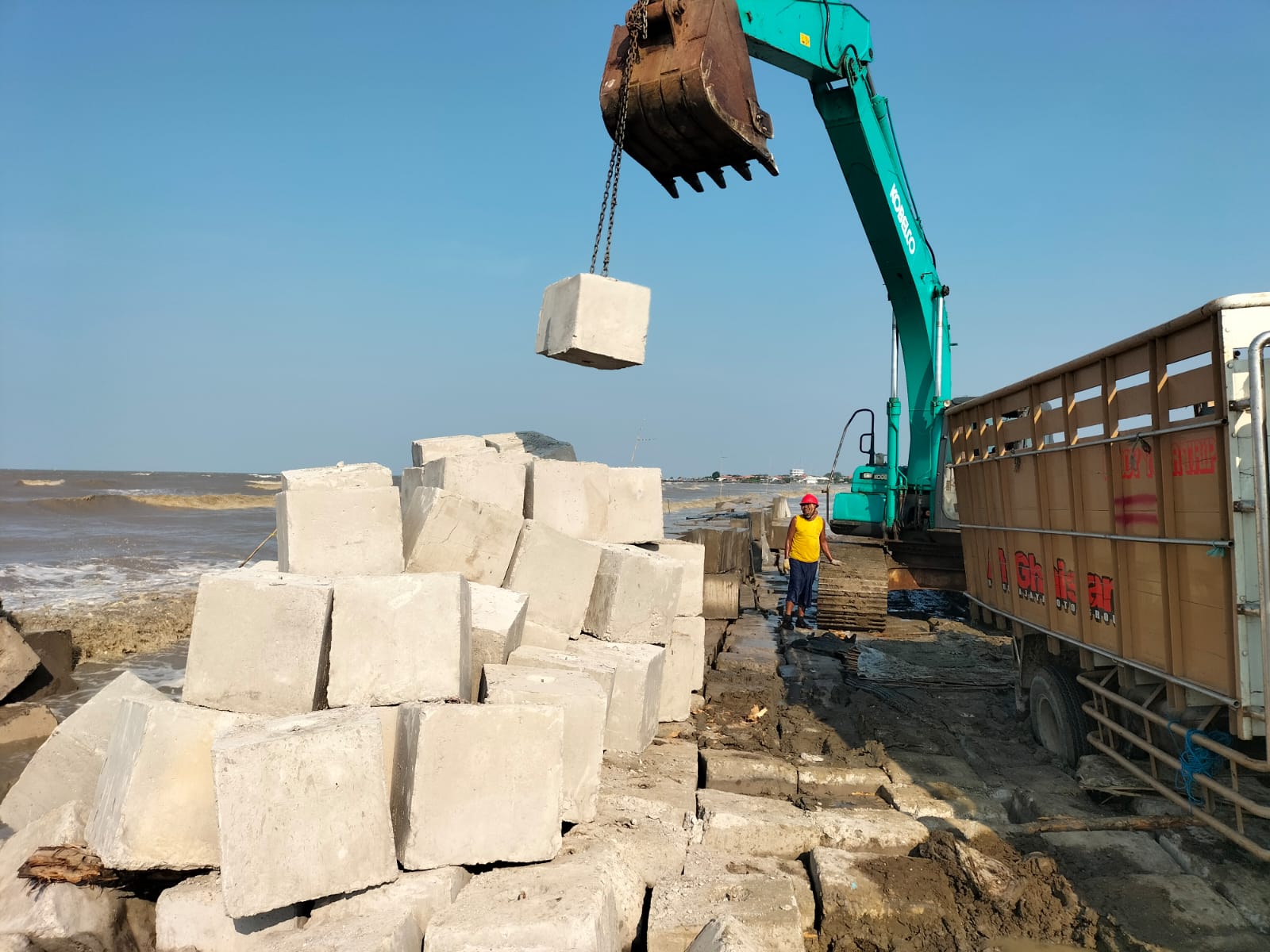 INDRAMAYU, indramayunews.id – Kordinator pelaksana PT. Bina Cipta Utama, KSO Ery menjelaskan, saat ini perkembangan proyek pembangunan Breakwater di Pantai Ketapang Desa Juntinyuat hingga ke pesisir pantai Desa Dadap Kecamatan Juntinyuat Kabupaten Indramayu, masih fokus pada pengerjaan penyusunan dan pelangsiran kubus kubus beton di sekitar bibir pantai dengan menggunakan alat berat exavator, Rabu (24/08/2022).