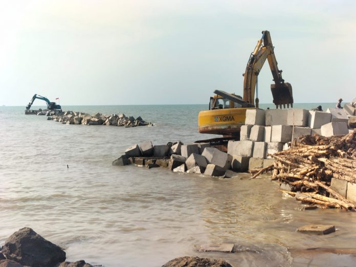 INDRAMAYU, indramayunews.id – Kordinator pelaksana pembangunan breakwater oleh PT. Bina Cipta Utama, KSO Ery menjelaskan, pengerjaan proyek breakwater di sepanjang pesisir Pantai Ketapang Desa Juntinyuat hingga Desa Dadap Kecamatan Juntinyuat Kabupaten Indramayu berjalan sesuai dengan rencana.