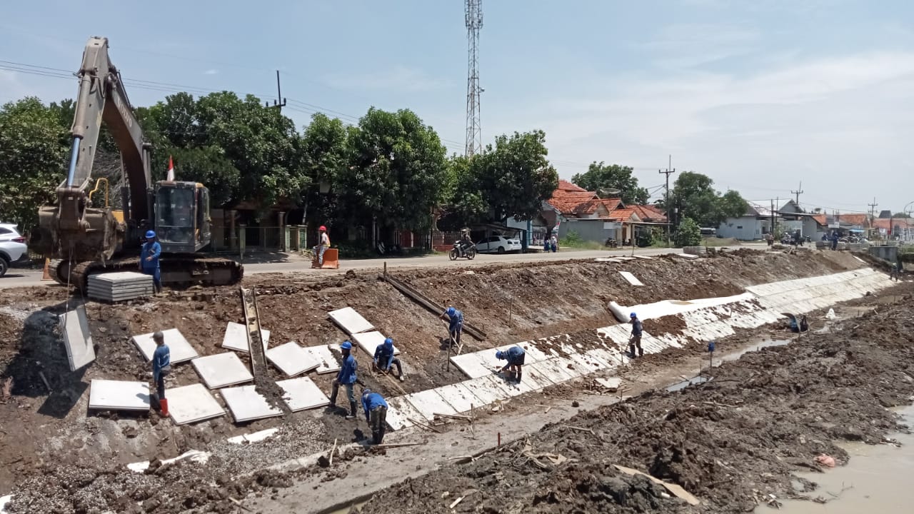 NDRAMAYU_Penanggungjawab PT. Hutama Karya, Cecep menjelaskan, kegiatan proyek di zona 2 (satu) wilayah Kabupaten Indramayu. Para pekerja tengah melakukan pemasangan lining, dan Normalisasi Saluran Irigasi Rentang Cipelang Desa Karanggetas Kecamatan Bangadua.