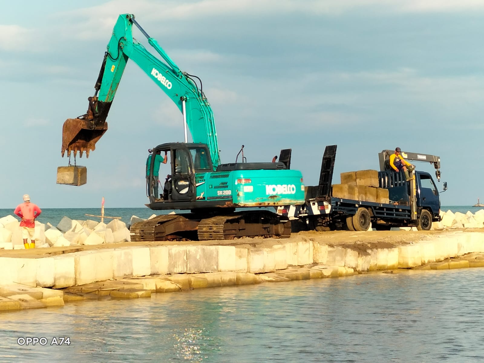 Sebanyak 3 unit alat berat exavator melakukan aktifitas pekerjaan untuk menaikan dan menurunkan kubus-kubus beton yang berada di sepanjang akses jalan laut. Dari pantai Ketapang hingga menuju pesisir pantai Desa Dadap Kecamatan Juntinyuat-Indramayu.