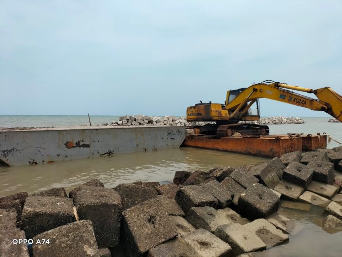 INDRAMAYU, indramayunews.id – Kordinator pelaksana PT. Bina Cipta Utama, KSO Hery menjelaskan, perkembangan pembangunan proyek breakwater yang ada di Pesisir Pantai Ketapang Desa Juntinyuat hingga Desa Dadap Kecamatan Juntinyuat Kabupaten Indramayu, berjalan dengan aman.