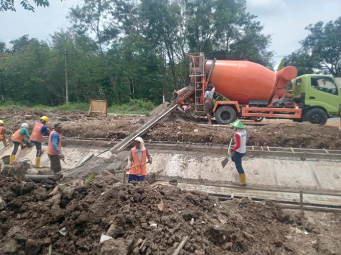 BANGODUA,indramayunews.id-Kegiatan di RIMP LSS 05 PT. Brantas Abipraya di Desa Pegedangan Kecamatan Tukdana Kabupaten Indramayu. Para pekerja tengah mengerjakan pasang lining di saluran sekunder Bangodua dan mortar.