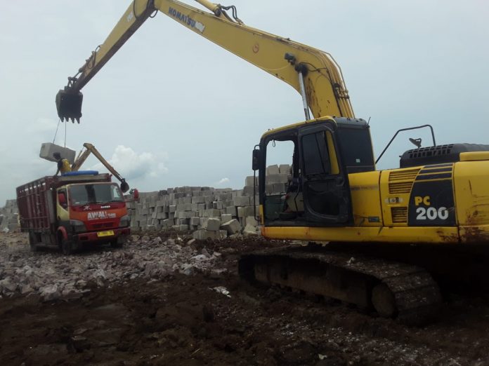Para pekerja saat ini masih fokus melangasir dan menyusun kubus dari titik nol dan sekarang sudah mencapai 675 meter, diarea pencetakan kubus Breakwater lepas pantai. Para pekerja juga menyusun dan melangsir kubus yg disuplai dari lokasi pencetakan Kecamatan Widasari dan dari lokasi pembuatan kubus di lokasi proyek, Sabtu (29/10/2022).