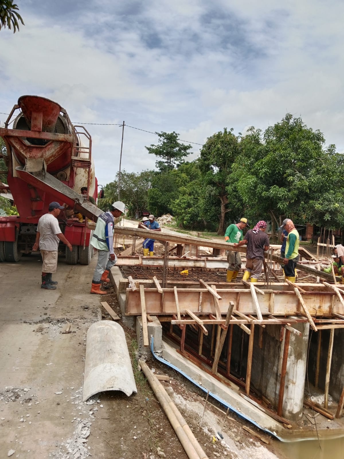 Selanjutnya pengerjaan kegiatan di RIMP LSS 08 PT. Bumi Karsa di Desa Cidempet Kec. Arahan. Mereka (pekerja, red) kini sedang dilakukan pembuatan jembatan hingga pengecoran jembatan. Di Desa Linggajati, pekerja tengah pemasangan begisting.