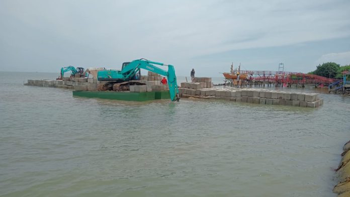 INDRAMAYU, indramayunews.id – Kordinator pelaksana PT. Aura Sinar Baru, KSO, Andi menjelaskan, perkembangan proyek pembangunan Breakwater (pemecah gelombang) di sepanjang Pantai Glayem  Desa/Kecamatan Juntinyuat Kabupaten Indramayu berjalan aman, Selasa (29/11/2022).