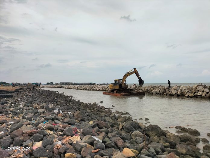 INDRAMAYU, indramayunews.id – Kordinator pelaksana PT. Bina Cipta Utama, KSO, Hery menjelaskan, perkembangan proyek pembangunan Breakwater (pemecah gelombang) di sepanjang 2,5 kilometer Pantai Ketapang Desa Juntinyuat hingga pesisir pantai Desa Dadap Kecamatan Juntinyuat Kabupaten Indramayu berjalan aman.