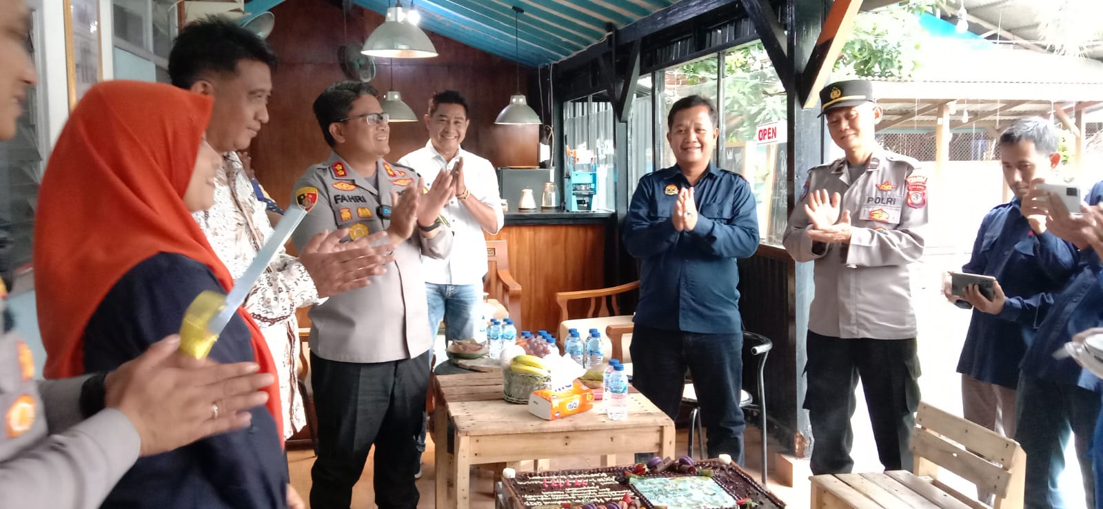 Suasana berubah meriah saat mantan Ketua PWI periode 2011_20 14 Adun Sastra didaulat untuk memotong kue. Lalu potongan keu ulang tahun diserahkan Kapolres dan sekaligus doa bersama.