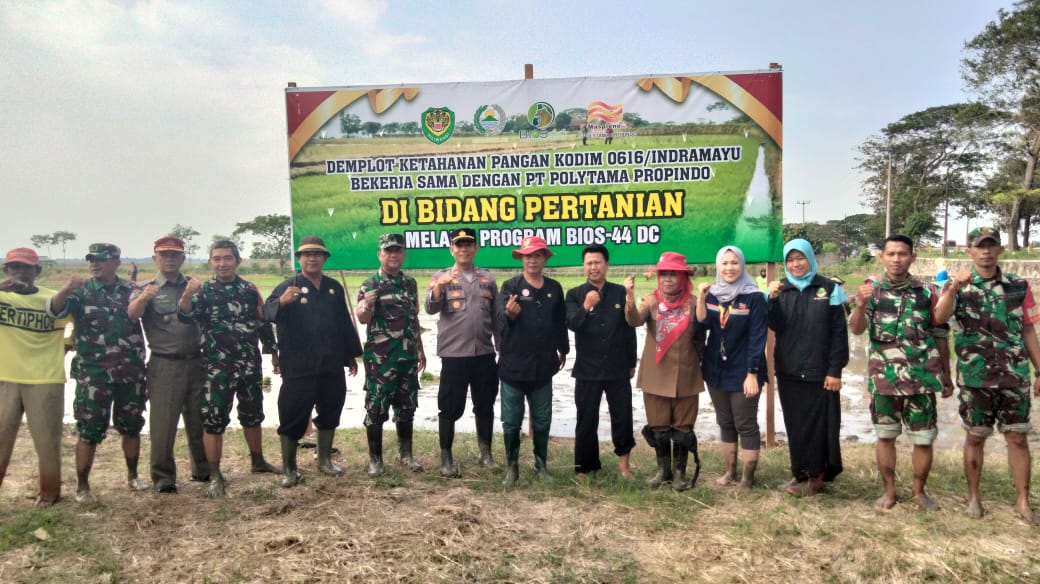Danramil 1609/ Juntinyuat Kapten Inf Sudiyanto didampingi Peltu H Sudiyono menjelaskan, tanam perdana di lokasi BPP Kordinator Juntinyuat Desa Juntikebon sebagai pilot project Demplot Ketahanan Pangan Kodim 0616/Indramayu di bidang pertanian melalui BIOS – 44 DC.
