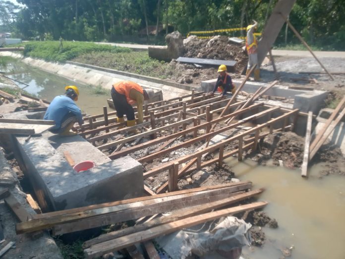 Humas PT. Brantas Abipraya Casnadi menjelaskan saat ini proyek di Desa Cangko sedang sedang membuat galian, pancang dolken dan cor pintu air tersier di saluran sekunder Cangko .