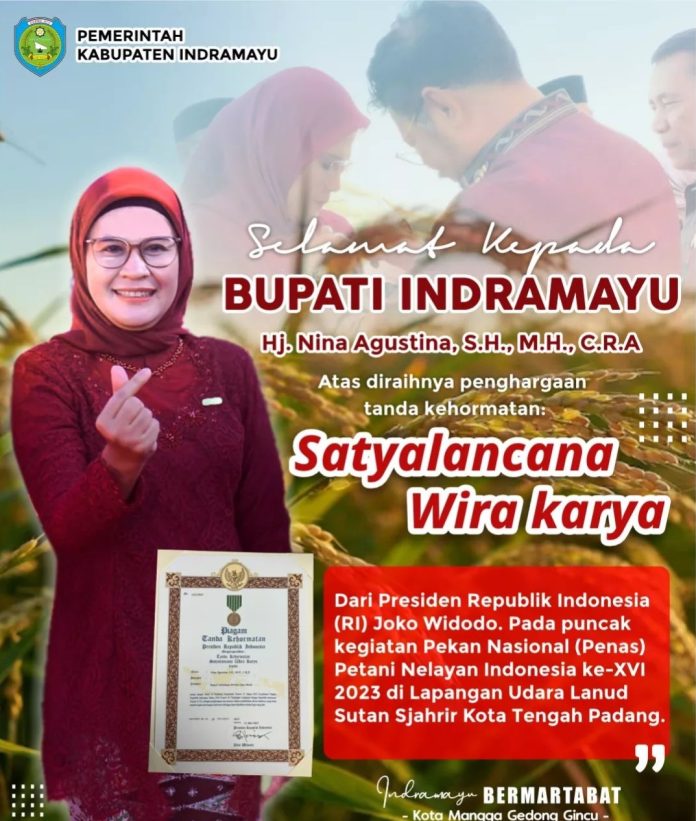 Pasalnya, Bupati Indramayu, Nina Agustina mendapat kehormatan untuk menerima Tanda Kehormatan Satyalancana Wirakarya Bidang Pembangunan Pertanian dari Presiden Republik Indonesia (RI) Joko Widodo.