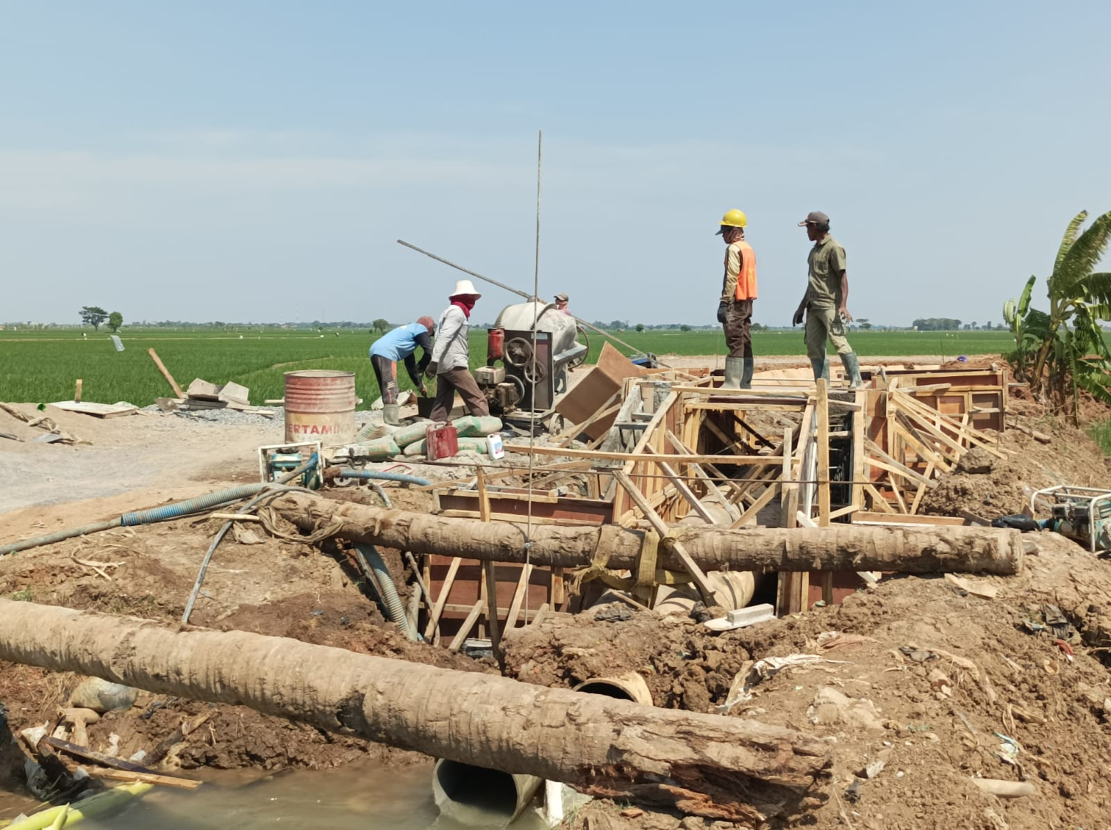 pengecoran pintu pembagi. Lalu kegiatan pemasangab wearmash, pembangunan jalan. Pengerjaan di Desa Pangkalan yaitu pemasangan pricas, besi cor, gorong-gorong dan pasang balok atas.