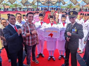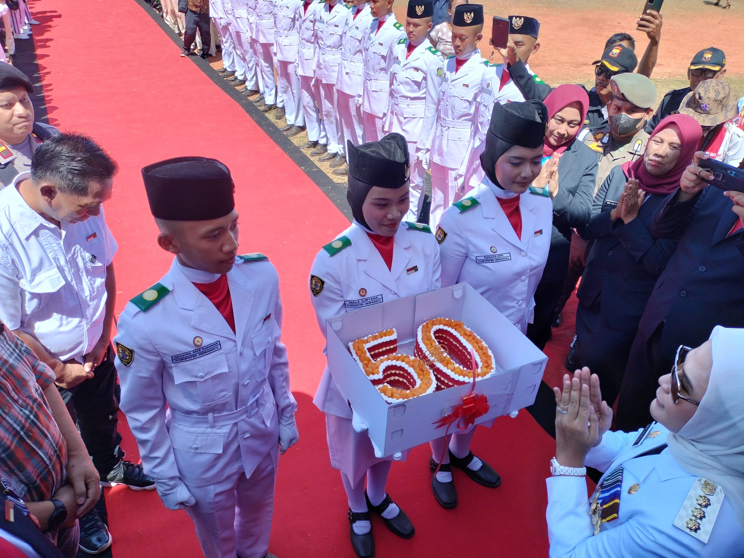 Ketua DPPI ( Duta Pancasila Purna Paskibraka) Kab. Indramayu, Fence Ferdinand Kilis mendampingi pasukan Paskibraka menyerahkan kue ulang tahun. Karuan saja, Bupati Nina yang saat itu mau menuju pulang mendadak terharu.