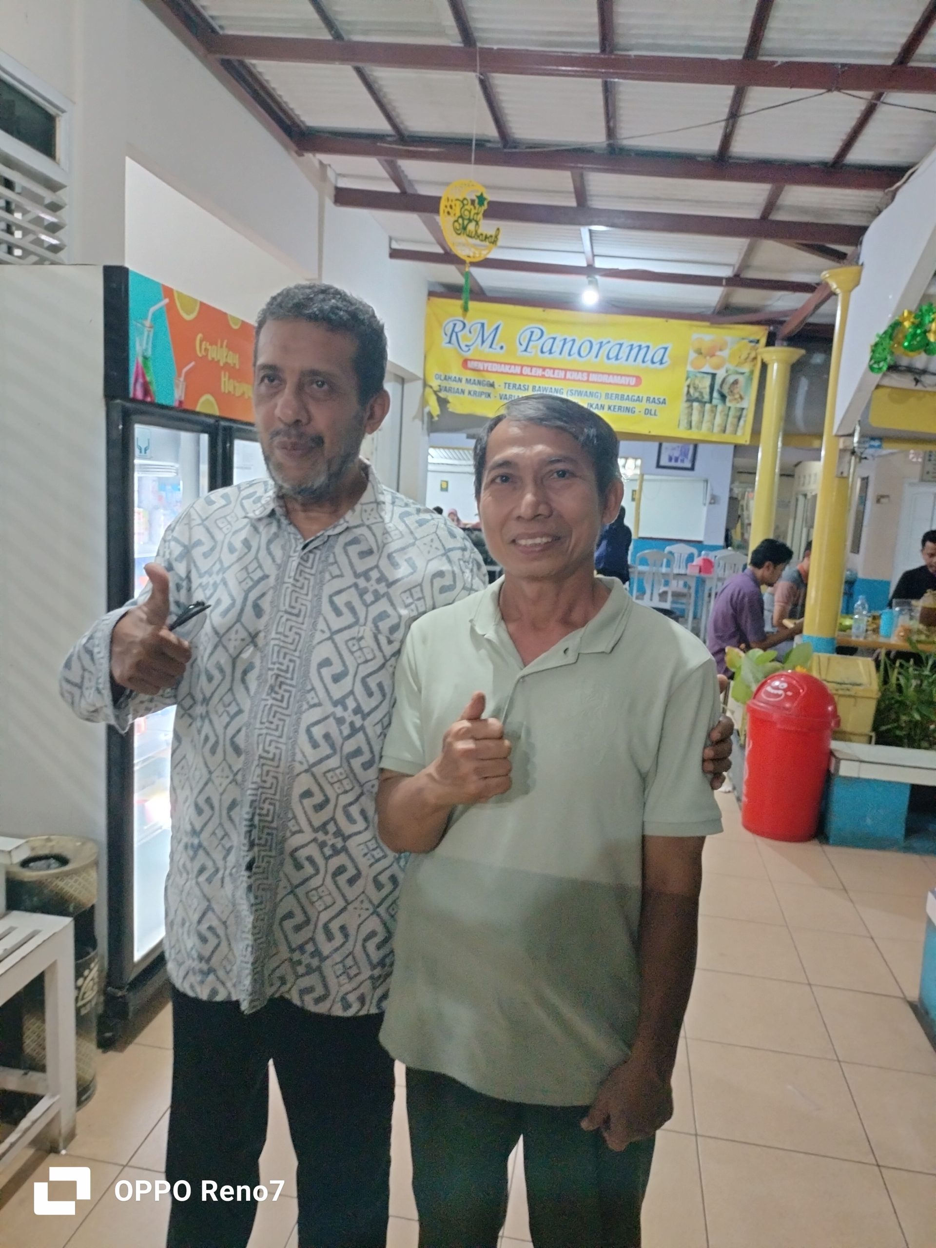 Direktur PT Esra Wisata, H Hisyam Sulaeman, bersama Owner RM.Panorama.H Warto SIP (kanan) berpose bareng usai bukber di rumah makan miliknya/indramayunews.id