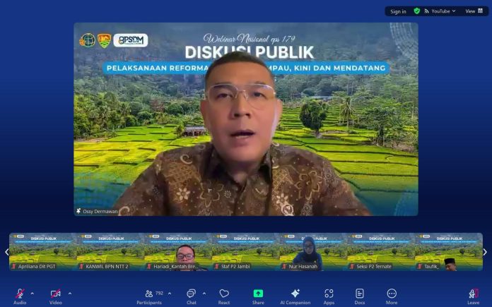 JAKARTA, indramayunews.id – Wakil Menteri Agraria dan Tata Ruang/Wakil Kepala Badan Pertanahan Nasional (Wamen ATR/Waka BPN), Ossy Dermawan, membuka Webinar Nasional Diskusi Publik “Pelaksanaan Reforma Agraria: Lampau, Kini, dan Mendatang” pada Kamis (17/07/2025). Dalam sambutannya, ia mengatakan bahwa Reforma Agraria bukan hanya tentang membagi tanah, tetapi juga tentang memperbaiki, membangun harapan, dan menciptakan keadilan yang berkelanjutan.
