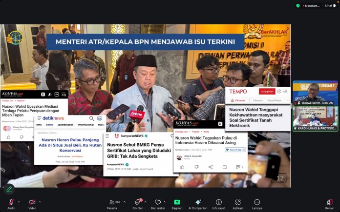 Dalam pertemuan daring ini, hadir sejumlah Pejabat Pimpinan Tinggi Pratama Kementerian ATR/BPN, dan Kepala Kanwil BPN Provinsi seluruh Indonesia beserta jajaran. (TIM)