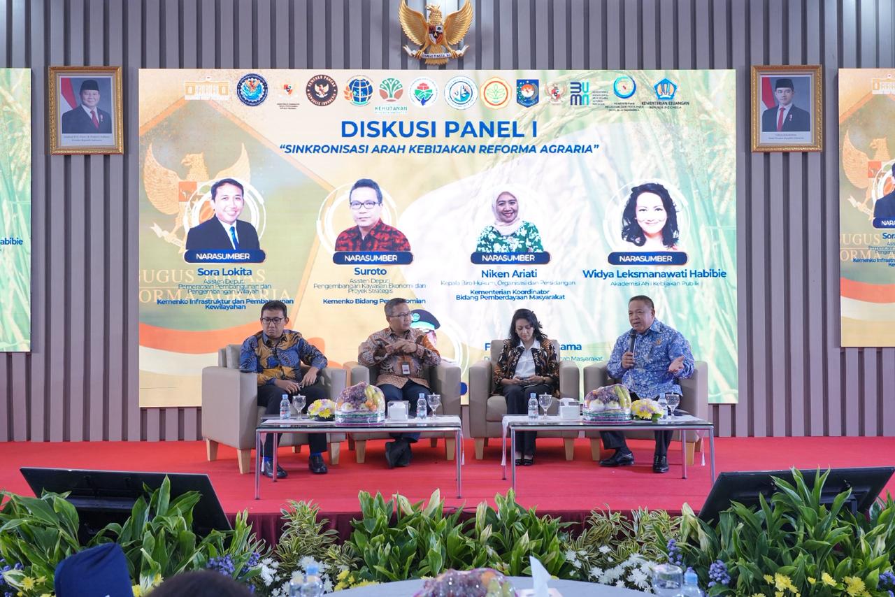 Usai pembukaan, Rakornas dilanjutkan dengan Diskusi Panel 1 yang mengusung subtema “Sinkronisasi Arah Kebijakan Reforma Agraria”. Diskusi menghadirkan sejumlah narasumber, yaitu Asisten Deputi Pemerataan Pembangunan dan Pengembangan Wilayah II, Kementerian Koordinator Infrastruktur dan Pembangunan Kewilayahan, Sora Lokita; Asisten Deputi Pengembangan Kawasan Ekonomi dan Proyek Strategis, Kementerian Koordinator Bidang Perekonomian, Suroto; Kepala Biro Hukum, Organisasi dan Persidangan, Kementerian Koordinator Bidang Pemberdayaan Masyarakat, Niken Ariati; serta Akademisi Ahli Kebijakan Publik, Widya Leksmanawati Habibie. Jalannya diskusi dimoderatori oleh Direktur Pemberdayaan Tanah Masyarakat, Freddy A. Kolintama.